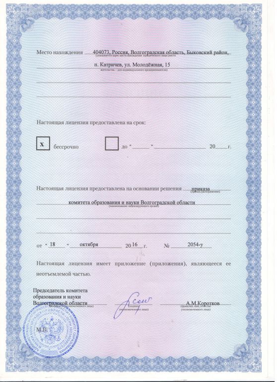 | Адрес местонахождения образовательной организации* | 404073, Волгоградская обл, Быковский р-н, Катричев п, Молодежная ул, строение 15 |